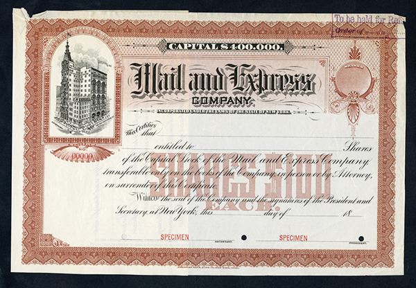 New York. Odd Shares Capital Stock Specimen Certificate, Black print on brown border and under tint, Paper building at top left corner, Specimen overprints and POC's, Fine to VF condition with damage to upper left corner and a small reinforced tear on the top right margin. ABNC.