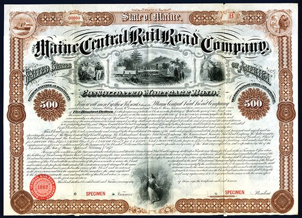Maine Central Rail Road Co., 1872 Specimen Bond. Maine, 1872, $500, Specimen 4% Consolidated Mortgage Coupon Bond. Brown border. Locomotive passing sailboat in river in middle, allegorical woman on right and bottom center and Maine Arms on left. Horizontal bond with coupons on bottom.. Red specimen overprints, POC's and "00000" serial numbers. Fine condition. Rare and attractive bond. Listed railroad in Cox, The listed example in Cox is from one of our previous sales.
