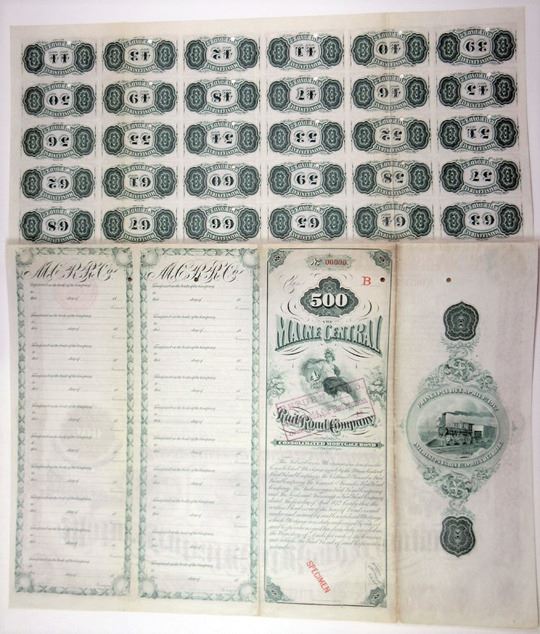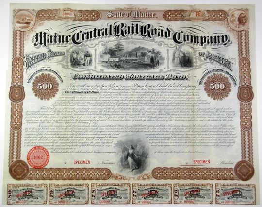 Maine, 1872. $500 Specimen 4% Consolidated Mortgage Coupon Bond, Black text with brown border, Maine state seal at top left, Train passing at center, Seated Justice at right. Red specimen overprints, 00000 serial numbers, and POCs. VF condition, Continental BN. Rare specimen in Cox.