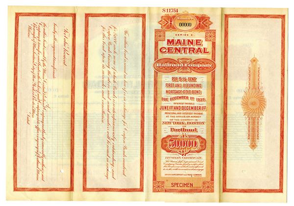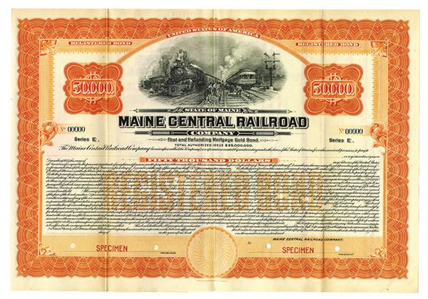 Maine. $50000 Specimen Series E, 5 1/2%, 1st and Refunding Registered Gold Bond, Black print on orange border and undertint in horizontal format, Image of workers between tracks with two oncoming locomotives, Specimen overprints, POC's, VF-XF condition, ABNC, Unlisted Color, Series and Amount variety on Cox.
