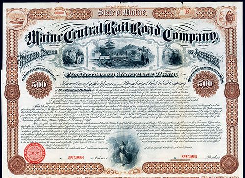 Specimen Consolidated Mortgage, 4%, Bond. Brown border. Locomotive passing sailboat in river in middle, allegorical woman on right and bottom center and Maine Arms on left. Horizontal bond with coupons on bottom.. Red specimen overprints, POC's and “00000 “ serial numbers. Fine condition. Rare and attractive bond. Listed railroad in Cox, unlisted early bond variety.