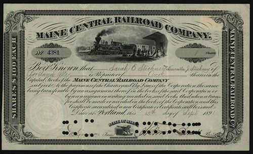Maine, 1891, I/C, #4381, 1 Share, Black print with ornate black border, locomotive at station with passengers waiting to board, POC's, VF condition, ABNC. Railroad and stock listed in Cox.
