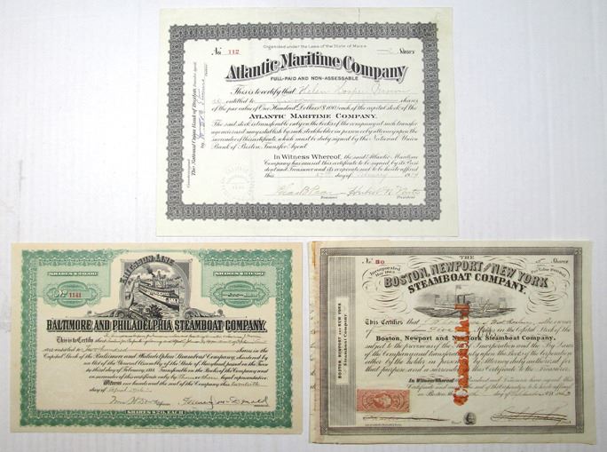 Various States, 1863 to 1928. Lot of 3 Stock Certificates, Includes: Boston, Newport and New York Steamboat Co., 5 Shares I/C Capital Stock Cert. with Revenue Stamp, S/N 30, 1863; Atlantic Maritime CO., 2 Shares I/U Stock Cert., S/N 112, 1914; and, Baltimore and Philadelphia Steamboat Co., 200 Shares Capital Stock Cert., S/N 1141, 1928, ABNC. Certificates range from Fine to VF+ condition. (3). Sold "AS IS" no returns accepted.