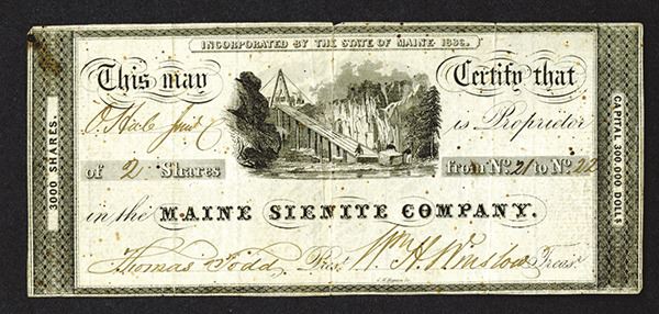 Maine. 2 Shares, I/U. Similar to Obsolete Currency note, but a 2 share certificate. Rock mine scene at top center. Old hinge and transfer note on back. Fine.