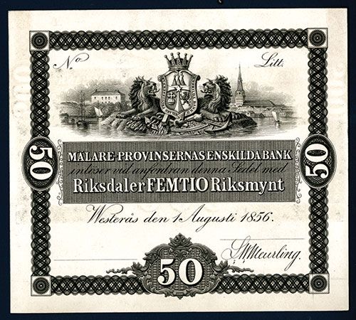 Sweden, 1856, 50 Riksdaler, P-S317, Crown supported Royal Arms, Black on thin white card, Uncirculated condition, Bradbury & Evans, Unpriced in SCWPM.