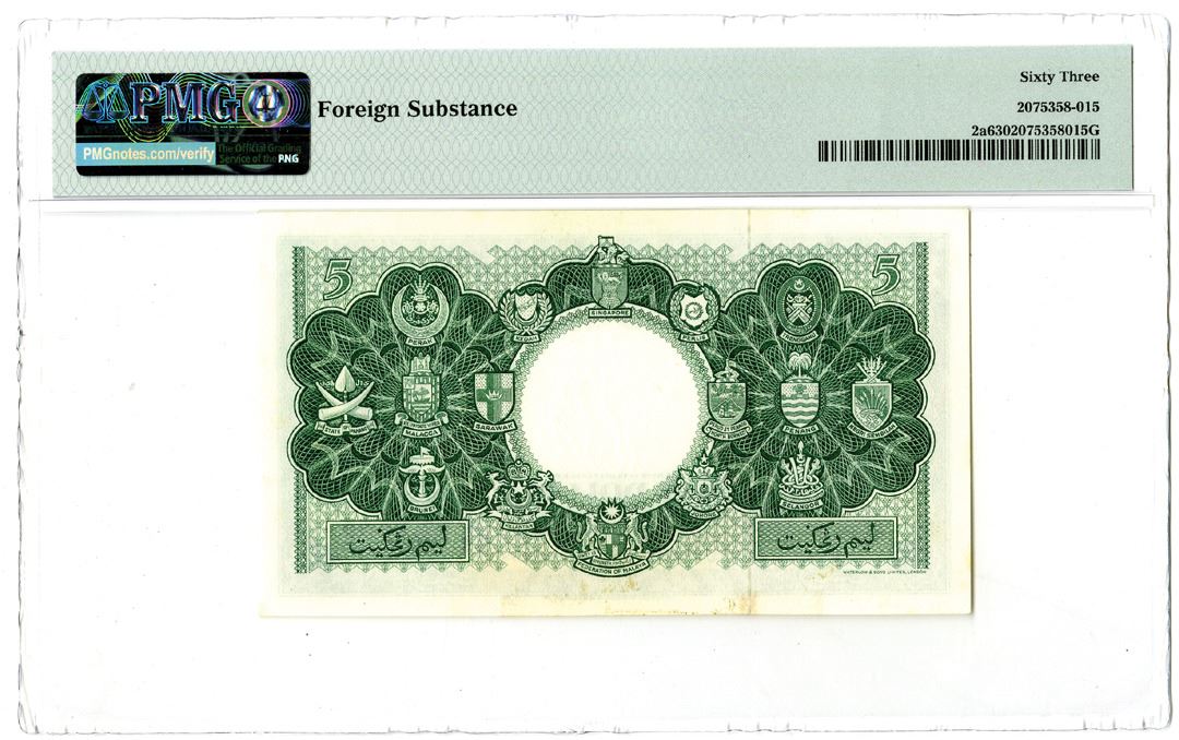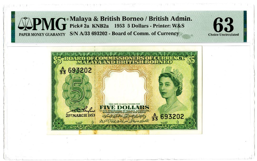 Malaya & British Borneo. 1953. $5, P-2a KNB2a, Issued Banknote. Green on brown and m/c underprint with Queen Elizabeth at right. S/N A/33 693202 with watermark of tiger head. PMG graded Choice Uncirculated 63 with comment "foreign substance." Printer: W&S.