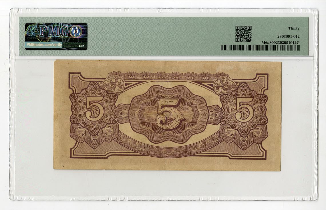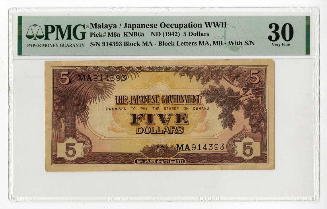 Malaya - Japanese Occupation WWII, ND (1942). 5 Dollars, P-M6a, Issued Banknote, Lilac on orange underprint with coconut palm tree at left and paw-paw tree at right, Back is purple with denomination printed, S/N 914393 Block MA, PMG graded Very Fine 30.