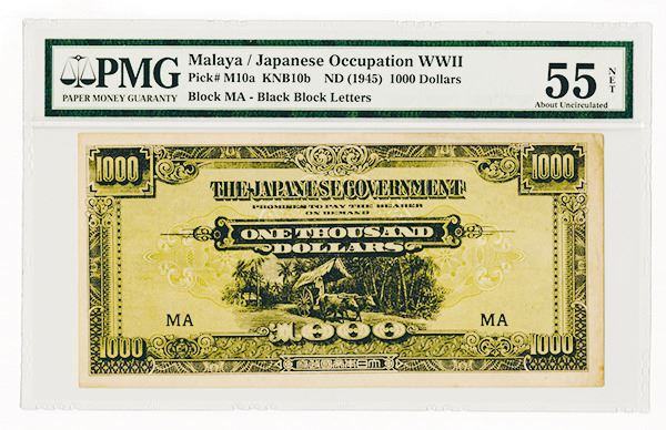 Malaya. $1000, P-M10a, Issued banknote, Greenish-black on olive green underprint, Ox cart at center, back olive green, man with buffalos at center, Black Block Letters "MA" with vertical upstroke and down stroke, with watermark, PMG graded About Uncirculated 55 NET. Rare note in high grade.