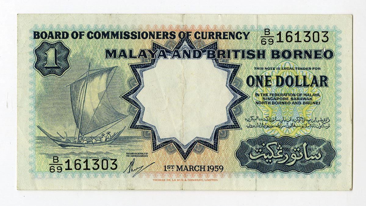 Malaya and British Borneo, 1959. 1 Dollar, P-8A, Issued Banknote, Blue on m/c underprint with sailing boat at left, Back is blue with men and boat at center with arms of 5 states at top, S/N B/69 161303, XF condition, TDLR.