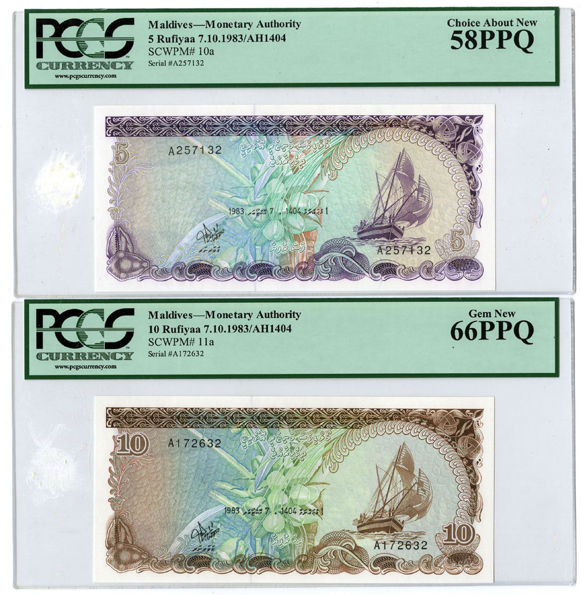 Maldives, 1983/AH1404. Lot of 2 Issued Banknotes, Includes: 5 Rufiyaa, P-10a, S/N A257132, PCGS graded Choice About New 58PPQ; 10 Rufiyaa, P-11a, S/N A172632, PCGS graded Gem New 66PPQ. (2). Sold "AS IS" no returns accepted.