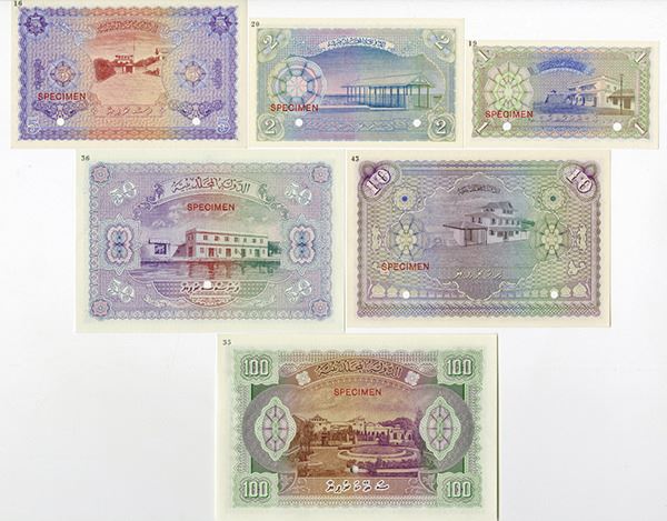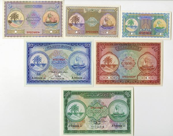 Maldives, includes 1 Rupee, P-2as; 2 Rupees, P-3as; 5 Rupees, P-4as; 10 Rupees, P-5as; 50 Rupees, P-6as; and 100 Rupees, P-7as. Overprinted SPECIMEN, POCs, Gem Uncirculated. (6)