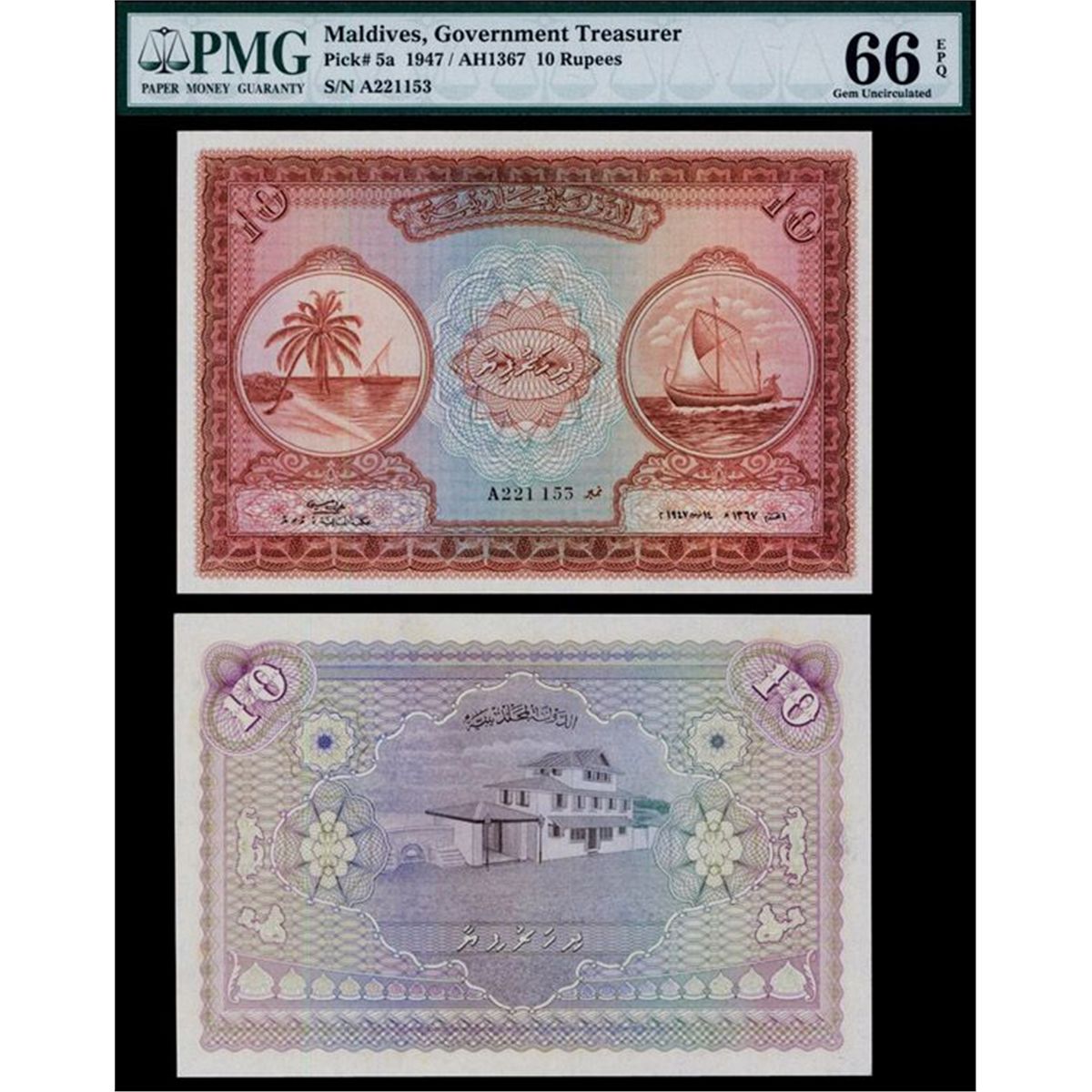 Maldives, 1960, 10 Rupees, P-5a, Issued banknote, Brown on light blue and m/c with Palm tree and Dhow at left and Dhow at right, back m/c, S/N A221153, PMG graded Gem Uncirculated 66 - EPQ (Exceptional Paper Quality), Scarce note that is rarely found in in superb condition.