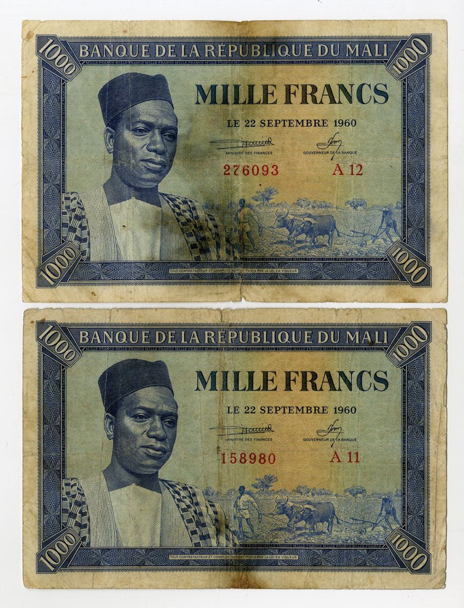 Mali, 1960. 1000 Francs, P-4 (2), Issued Banknote Pair, Blue on light green and orange underprint. S/Ns A11 158980 & A12 276093, Good to Fine condition, STC. (2). Sold "AS IS" no returns accepted.