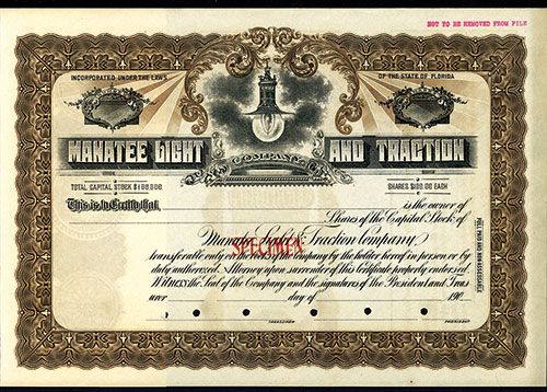 Florida, 190x, Specimen Stock, Odd Shares, Black on brown border and underprint, Light bulb top center, Red SPECIMEN overprint and POC's, SBNC. Unlisted railroad and stock in Cox.