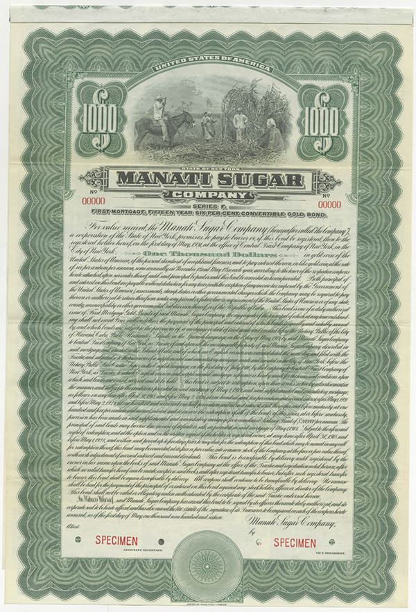 Cuba (Inc. in New York), 1916, $1000, 1st Mortgage 15 Year Convertible Gold Specimen Bond, Vertical format, Coupons attached, Black print on green border and underprint, Sugar cane farming top center, Red SPECIMEN overprints POC's and s/n "00000", VF condition, ABNC.
