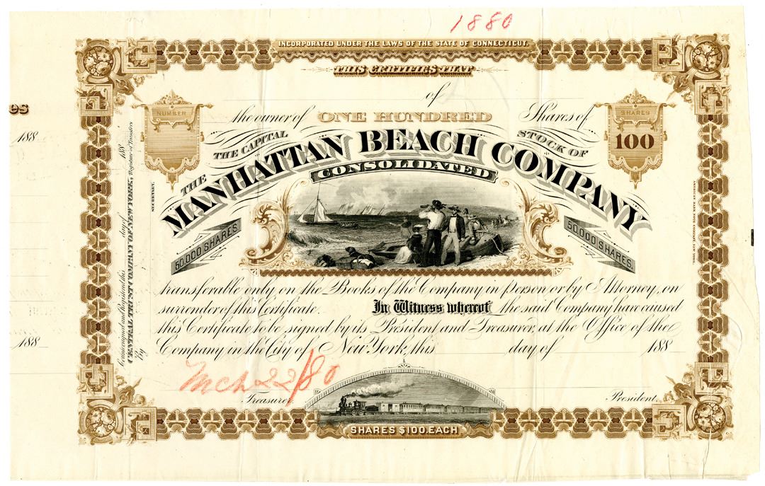New York. (Inc. Connecticut), 1880. 100 Shares Proof Capital Stock Certificate, Black text with brown border, Men standing on beach looking at ships at top center, Train passing at bottom. Handwriting on both front and back added during proof design process. Fine condition with some damage to margins, water stain on back. Rare, only listed as a proof in Cox, ABNC. Austin Corbin was President of the Manhattan Beach Company, which built a simple wooden drawbridge in 1880. Corbin (July 11, 1827 - June 4, 1896) was a 19th-century American banking and railroad entrepreneur. He consolidated the rail lines on Long Island, bringing them under the profitable umbrella of the Long Island Rail Road (LIRR). He was the owner of Manhattan Beach, a resort in Brooklyn, New York City, from which he barred Jews. He was also the owner of the Sunnyside Plantation in Chicot County, Arkansas, from 1886 to his death in 1896, where he used convict laborers and later brought Italian immigrants to work on the land.