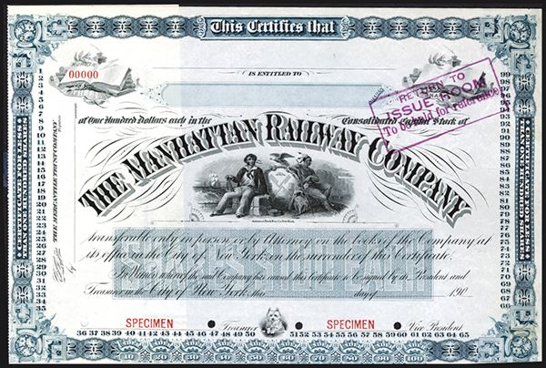 New York, NY. 190x (1903), Odd Shares, Specimen Stock certificate, blue border and underprint, New York Arms with sailor and Native American seated with ship in back ground under arched title, Rare and attractive stock certificate. ABNC. Unlisted variety in Cox with underprint "Shares $100 Each" in middle, POC, Specimen overprint,
