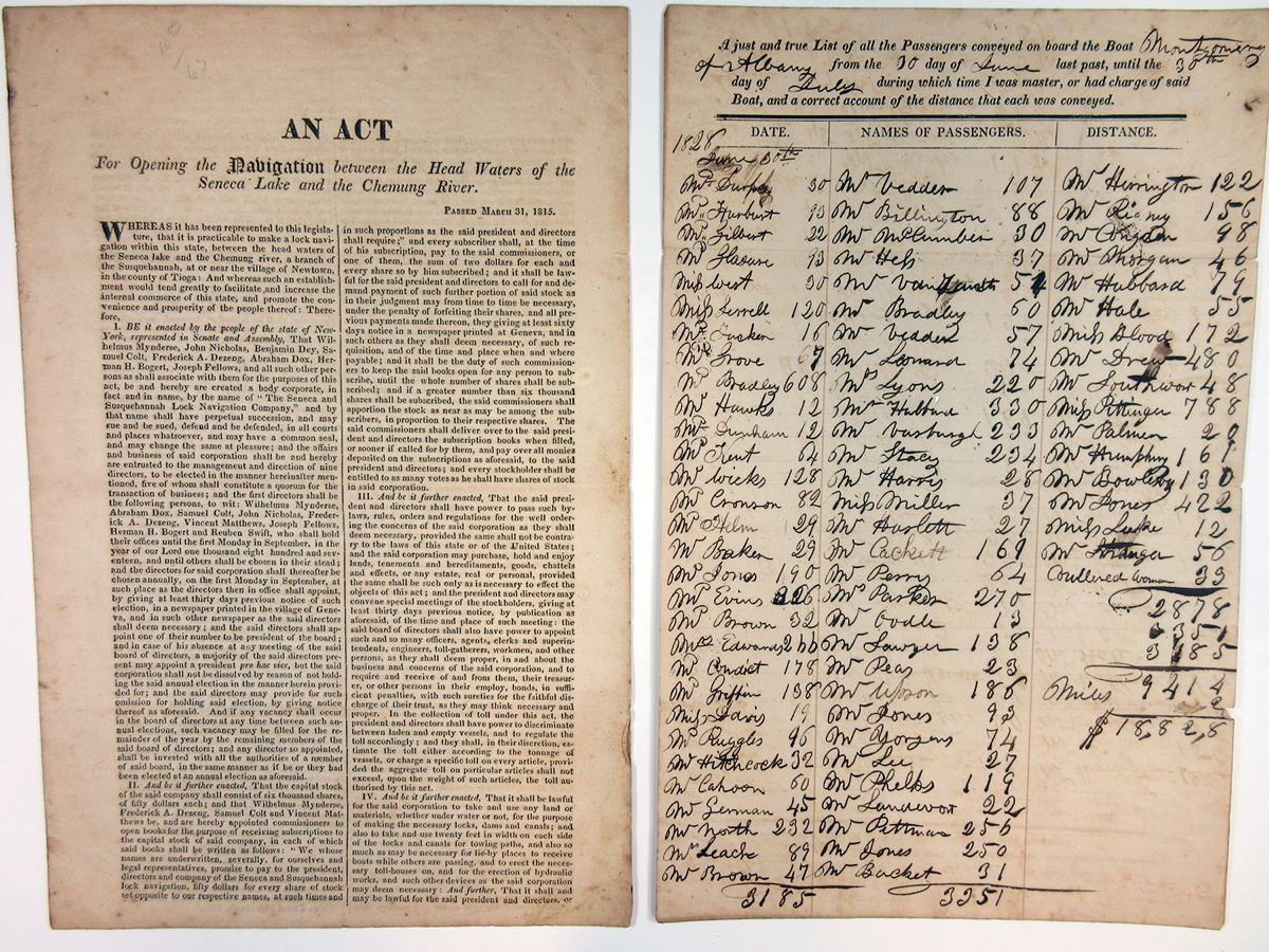 New York. 1828 Manifest of passengers for the "Montgomery of Albany" from June to July 1828 with the mileage each Passenger Travelled. Included in the lot is a pamphlet for "Opening the navigation between the Head Waters of the Seneca Lake and Chemung River." Both pieces are Fine-VF condition with minor splitting at fold lines, light foxing and small faults.