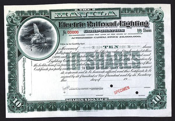 Manila, Philippines. Green frame, Specimen for 10 shares, exquisite and rarely seen vignette of a semi-nude angel holding an electric globe, ABNC, EF. The company controlled all of the street and suburban railways, and the Manila power plant. First seen by this cataloger.