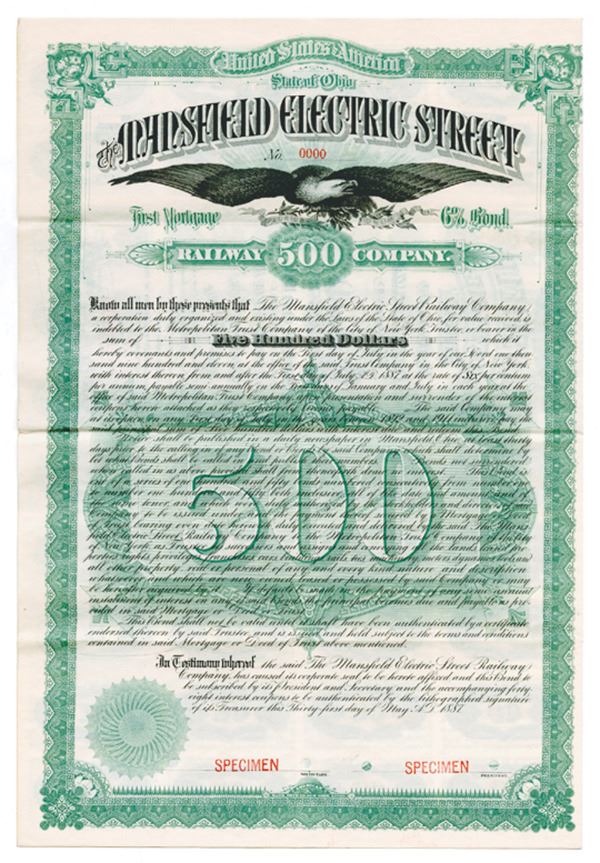 Ohio. 1887 Specimen $500 First Mortgage 6% Bond, green, eagle, Uncirculated, POC's, folded in quarters, as made. ABNC. Known railroad, unknown as a bond, only as a stock certificate in Cox. This was the only example found in the ABN archives in 2002.