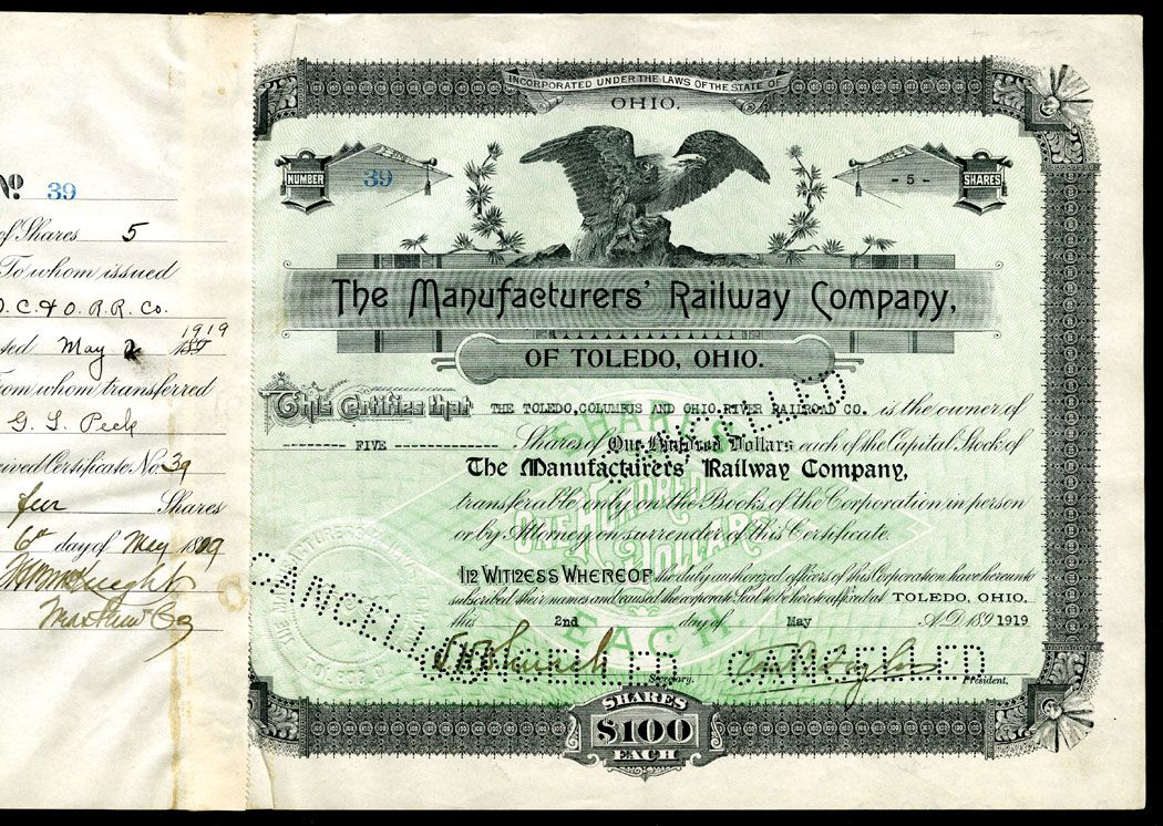 Toledo, Ohio, 1919, Manufacturer's Railway Co. 5 Shares, $100 each, Stock Certificate, VF Condition.