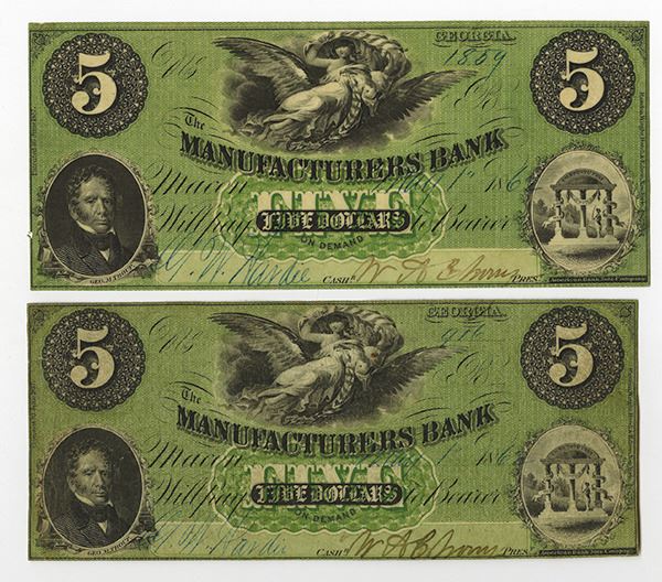 Macon, GA., Lot of 2 issued obsoletes, Includes, both are $5, GA-200-G24A examples, one in Choice Fine and the second in Choice XF to AU, both with full dark green tints, Attractive and desirable notes. RWH&E.