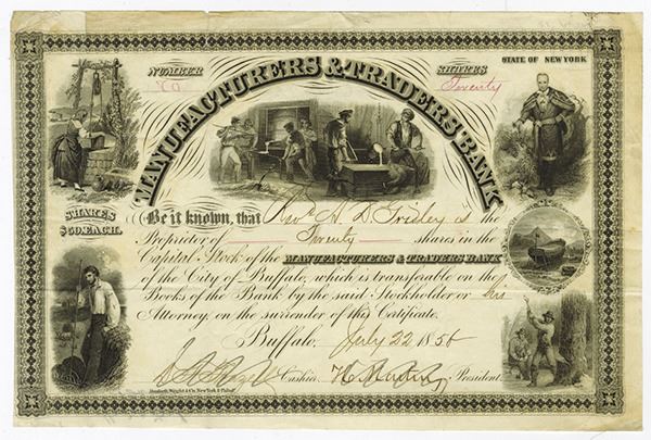 New York. 20 Shares Capital Stock I/U Stock Certificate, Black print on black border and under tint, Company title at top with multiple vignettes on certificate, Images include Native American, metal workers, Agricultural scene and wood chopper, S/N 20, Fine-VF condition with toning and splitting at areas, Danforth, Wright & Co. Extremely attractive multi vignette certificate.