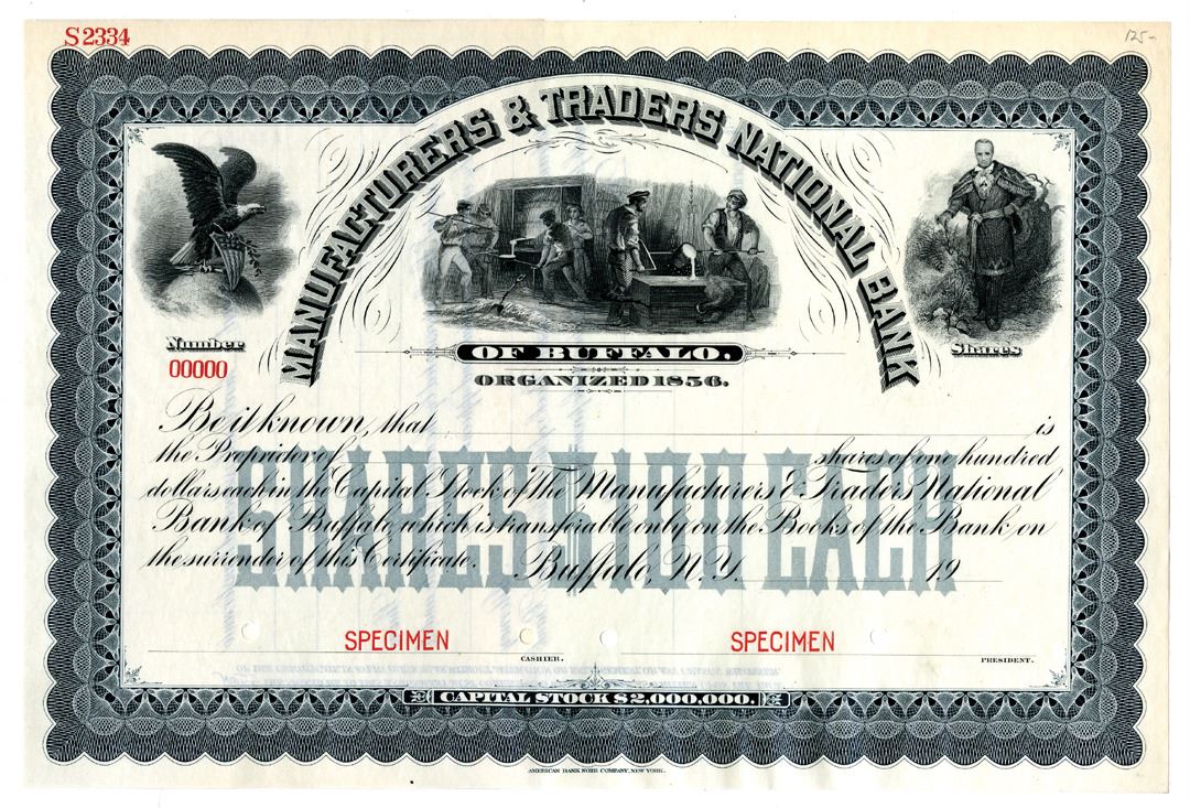 Buffalo, New York, ND (ca.1900s). Capital Stock Specimen Certificate, Black with steel gray border and underprint, Vignette of foundry and metal workers at top middle under curved title flanked by patriotic eagle at left and native American at right, Specimen overprints and POCs, Uncirculated condition with counterfoil at left folded back, ABNC.