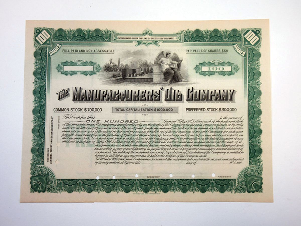 Delaware. 100 Shares Preferred Stock Specimen Certificate, Black print on green border and under tint, Allegorical woman at top with oil field behind her, POC's, VF-XF condition, SBNC.