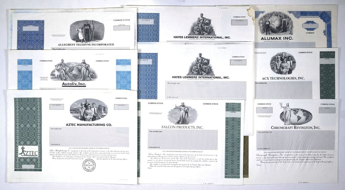Lot of 8 items. This group features eight proof stock certificates from a range of American manufacturing and industrial companies. Each certificate includes a fully printed title, vignette, descriptive text, and colored border, with face-only printing and blank reverses. These proofs were produced as part of the design and approval process and were not intended for circulation. Included are Hayes Lemmerz International Inc, a leading global supplier of automotive wheels and brake components, with a blue border; Chromcraft Revington Inc, a manufacturer of residential and commercial furniture, with a green border; Falcon Products Inc, a producer of furniture and fixtures for hospitality and institutional use, with a green border; Aztec Manufacturing Co, a diversified firm involved in metal coatings and precision components, with a green border; Autoliv Inc, a global leader in automotive safety systems such as airbags and seatbelts, with a blue border; Alumax Inc, one of the largest aluminum producers in North America, with a dark blue border; Allegheny Teledyne Incorporated, a company focused on specialty metals and aerospace technologies, with a blue border; and ACX Technologies Inc, a manufacturer of advanced materials and environmental control systems, with a green border. Overall condition is Very Fine to Uncirculated. Almost all of these certificates are rare as proofs and progress proofs, with many being unique in this format, or only 2 or 3 known in the ABNC Archives.