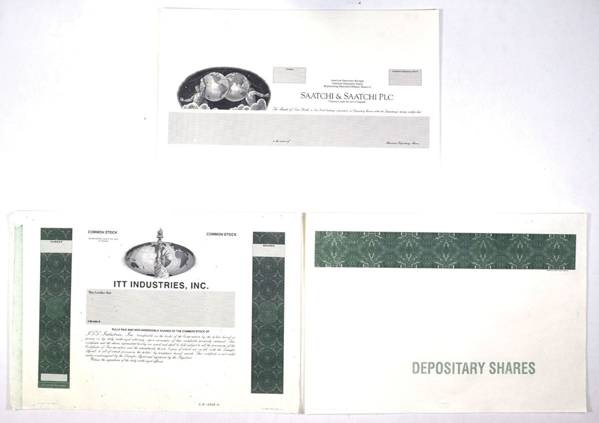 Lot of 2 companies, 1 is a progress proof of 2 parts, border without vignette and a vignette with text and no border, Includes Saatchi & Saatchi PLC, a global advertising company, with a separate dark green border; and, ITT Industries, Inc., a diversified manufacturing company, with a green border; all are face-only with blank reverses. Printed primarily by the American Bank Note Company. Overall condition is Very Fine to Uncirculated.