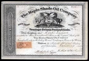 Pennsylvania. 1865. 200 Shares, Cert.#1247, Black Border, Arms of PA, Issued and uncancelled, Revenue Stamp Attached. VF. Scarce Pennsylvania oil stock.