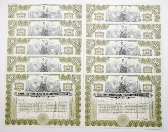 New Jersey......., 1919. Lot of 10 certificates. All are I/U 50 Shares, Capital Stock Certificate, Black on olive green border and underprint, Allegorical Justice at top between two hemispheres of the globe with telegraph towers, S/Ns B5140-B5149, All are in VF to XF condition. ABNC. (10). Sold "AS IS" no returns accepted.