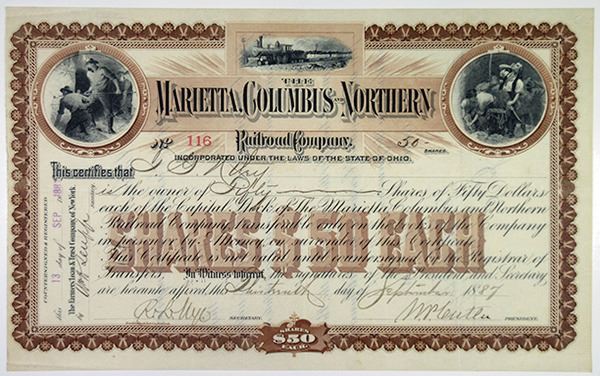 Ohio. 1887, 50 Shares, S/N #116 I/U Capital Stock Certificate, Black text with brown border and underprint, Illustration of miners at work on upper left and right corners in circle with a small coal train on the top middle. Brown text with brown border and underprint, Fine-VF condition, FBN. Only found as I/U in Cox. Rare with this being the second example found. From an old-time Ohio collection.