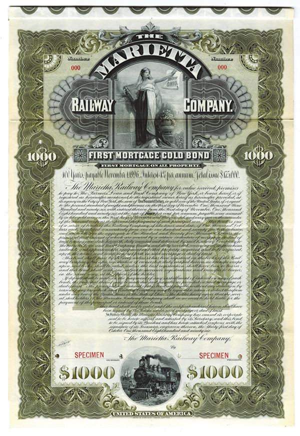 Ohio. $1000 Specimen 4% 1st Mortgage on all property Gold Coupon Bond, Black print on olive green border and under tint, Allegorical standing woman at top, Specimen overprints and POC's, VF-XF condition with slight toning along left margin, ABNC. 1 of 2 bonds of this type found and the only one that is available.