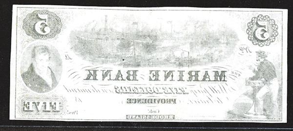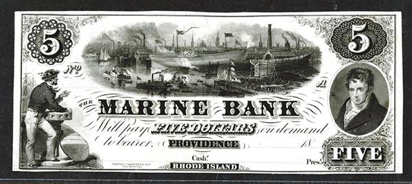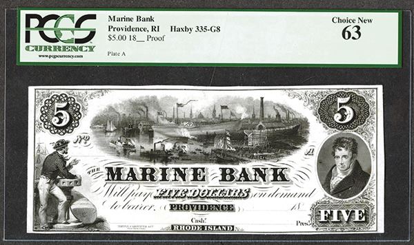 Providence, Rhode Island. $5, Haxby 335-G8m Plate A, Proof printed on india paper, Launching of the Adriatic vignette, TC&C. PCGS graded Choice New 63.