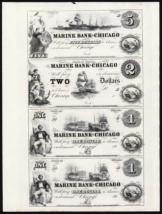 Waterloo, Illinois, Uncut sheet of 4 notes, ND (originally printed ca. 1850-60's, these are ca.1960-70's), $5-$2-$1-$1, (IL-165-G10a; G6a; G2a; G2a), All are SENC in Haxby, Unlisted with only American Bank Note Company imprints, Haxby lists notes as TCC with ABNC monograms, these notes do not have TCC or monogram, only American Bank Note Company imprints, Modern ÒProprietary Proof SheetÓ, The $1 note has sailor with flag sitting on barrel and bales on left, sailing ships at dock with men rowing row boat on top center and state seal on LR; The $2 note has sailor and woman with flag on left, sailing ship in full sail on top center and state seal on LR; The $5 note has 3 allegorical women on left and impressive steamboat and sailing ships on top center and state seal on LR, Black printing without border and underprint printed on thin white card, Uncirculated condition with wavy paper. ABNC. Rare as uncut sheet. (ABN Commemoratives, AIA XI, May 15, 2012)