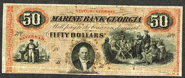 GA. Military figure (Washington?) speaking with Natives at right. Unissued remainder. Ink burn spotting in center. Fine+.