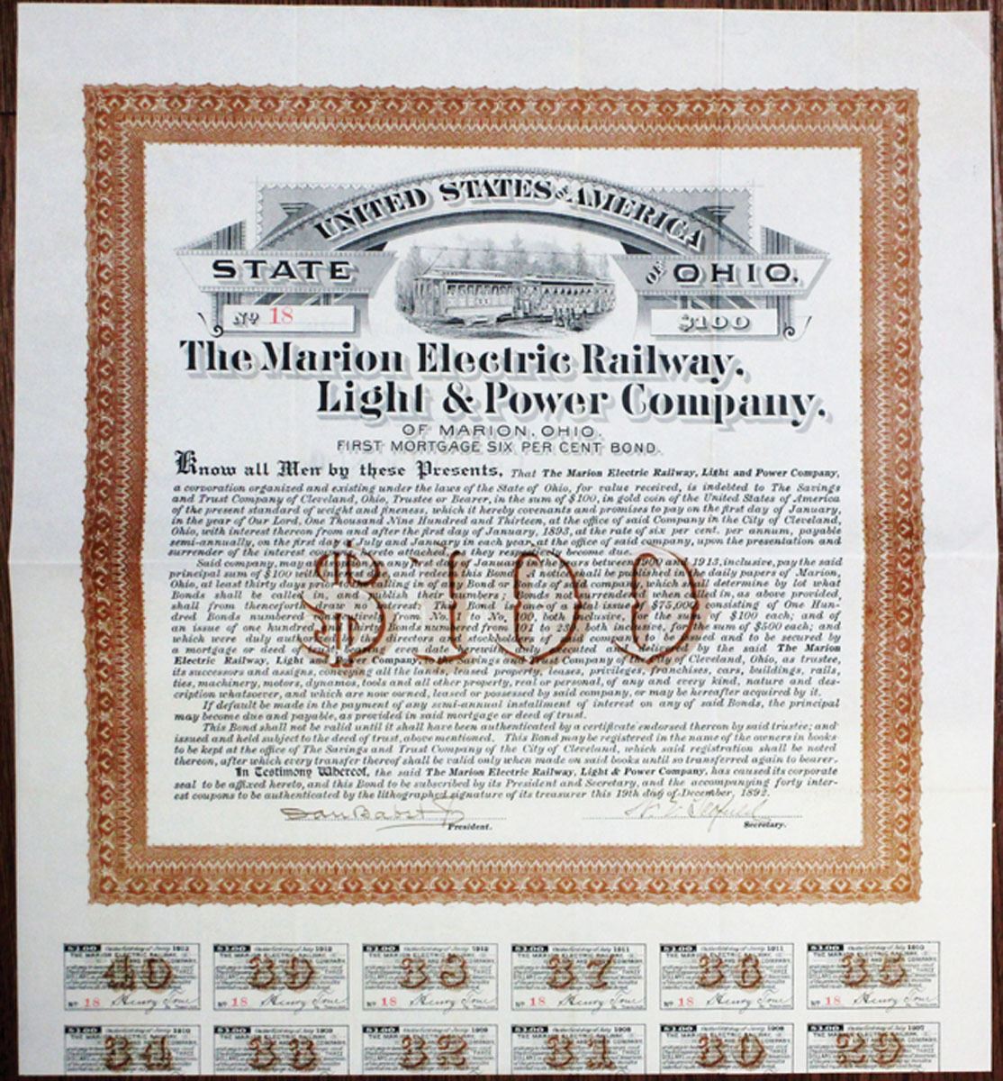 Marion, Ohio, 1892. $100 I/U 6% First Mortgage Coupon Bond, S/N 18, Black text with brown border and underprint, Streetcars with passengers depicted at top center, Embossed seal at bottom right corner. VF condition. Only listed in I/U format in Cox.