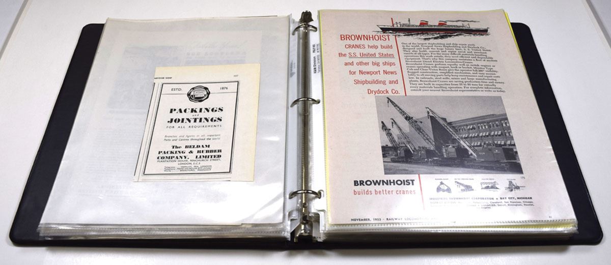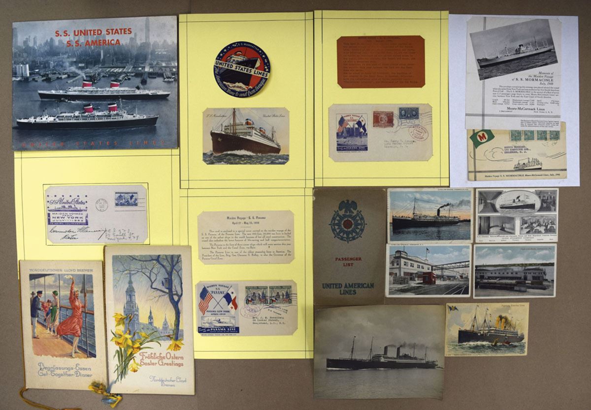 Maritime Advertising, Ephemera, Steamship Post cards & Correspondence Collection of over 90 items, Featuring United States Lines, Hamburg-America, Clyde-Mallory & More, 1910s to 1980s, Binder of maritime advertising, promotional material, correspondence, covers, menus, postcards, and related ephemera spanning 1910s to 1980s, with emphasis on prominent passenger lines. Advertising highlights include United States Lines pieces from 1925–1936, a 1952 pamphlet, and 1984 customer service bulletin; Beckett, Laycock & Watkinson Ltd. (1952); Brown hoist Cranes (1953); Panama Pacific Line (1934 & 1935); American President Lines (1949); Mediterranean Cruise Lines (1930); Hamburg American Lines (1930); and North German Lloyd adverts. Maritime ephemera features covers from the maiden voyages of S.S. United States (1952), S.S. Cristobal (1939), S.S. Panama (1939), and S.S. Mormacisle (1946); United States Lines postcards and labels; photograph and postcard of Hamburg-America Line; Holland-America Line postcard collection; and menus from S.S. Muenchen (March 30, March 31, April 6) and S.S. Bremen (1959). Correspondence includes Clyde-Mallory Lines letterhead, Clyde Steamship Co. and Clyde-Mallory Lines communications, and a letter from Gress Manufacturing Co. Additional items include a 1914 Western Union Telegram regarding route changes to Germany due to the Great War, a National Postage Stamp Show group of four stamps, a travel agent advert, and an advert for National Dairy Products. A diverse and well-preserved assortment offering insight into 20th-century ocean travel and related commerce. (Garden State Railroad Collection).
