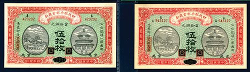 Lot of 2 notes, both are China, 1915. 50 Coppers, P-602b (S/M #T183-4a), Issued banknote, Black on blue and red, Hillside Pagoda on left and Temple of Heaven on right, Both are PMG graded Gem Uncirculated 66 EPQ (Exceptional Paper Quality), Extremely attractive and high grade banknote pair.