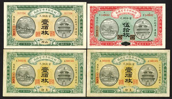 China. 50, 100 Coppers. P-602; 603 (3). Temple of heaven at right. Two are Choice Very Fine, two are Extremely Fine. 4 pieces.