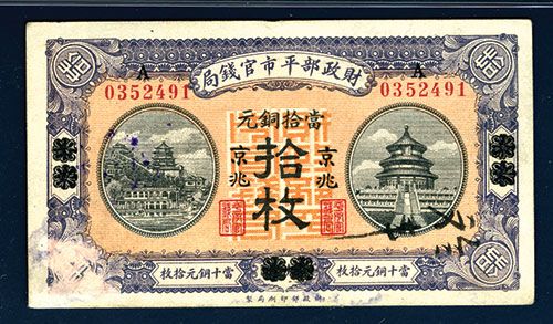 China, 1919, 10 Copper Coins, P-604a (S/M#T-183-10a), Issued banknote, Temple at left and Temple of Heaven at right, Branch name blotted out with overprint, S/N 0352491, PMG graded About Uncirculated 53 NET with notes of paper pull and annotation.