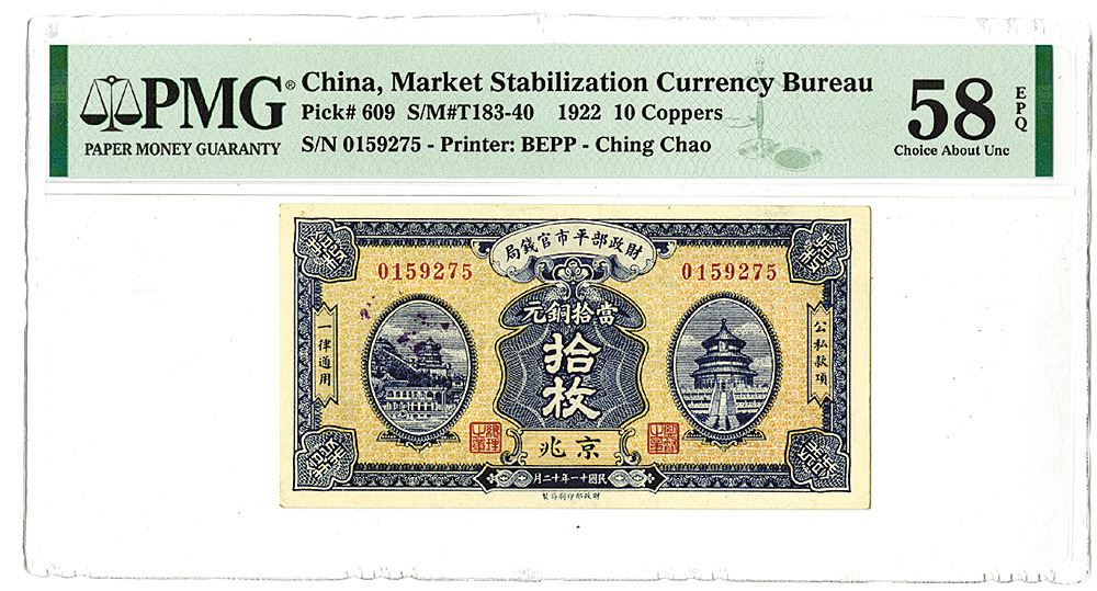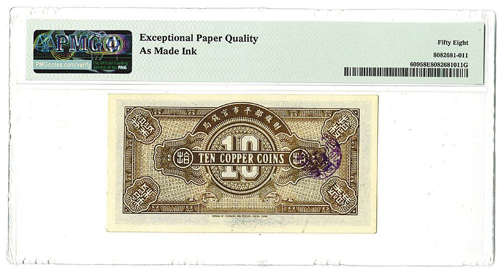 China. 1922. 10 Coppers, P-609, S/M#T183-40, issued banknote, Ching Chao, PMG Graded Choice About Unc 58 EPQ with comment "As Made Ink", BEPP.