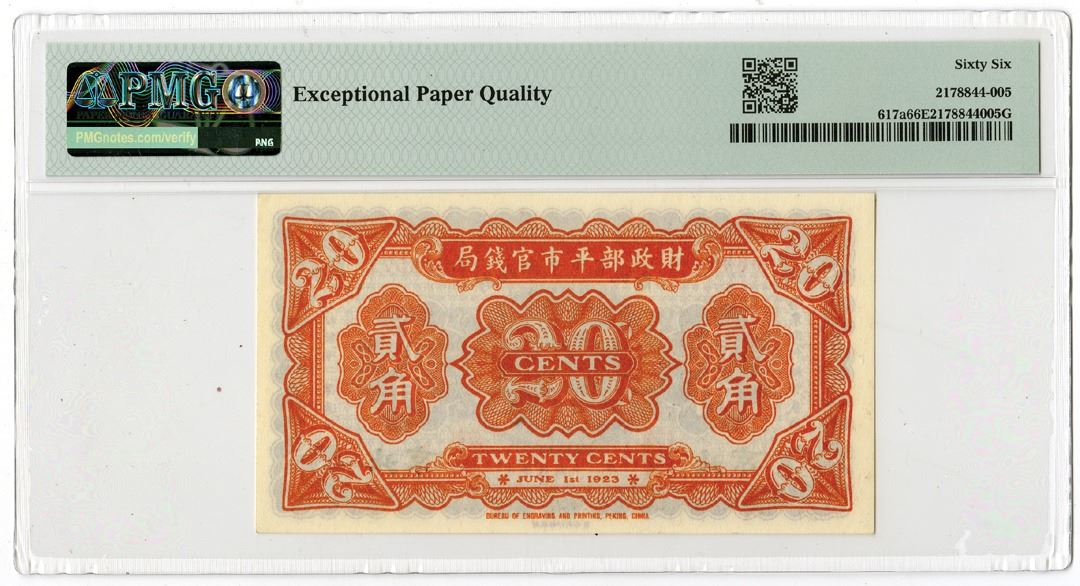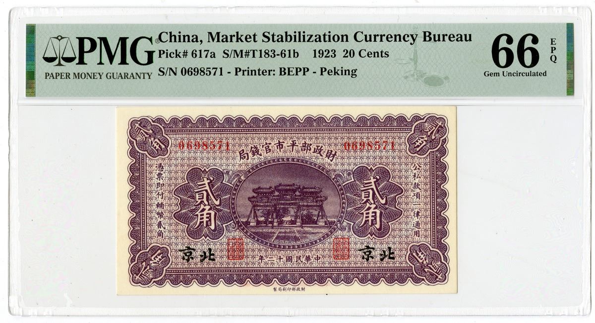 China, 1923. 20 Cents, P-617a, S/M#T183-61b, Issued Banknote, Purple on purple underprint with Palace at center, back orange, S/N 0698571, PMG graded Gem Uncirculated 66 EPQ, Printer: BEPP - Peking. Only 2 notes grade higher out of 87 notes graded in the PMG census. During the height of the market in 2022, a similar graded example sold for over $1900. This lovely note will be almost impossible to improve upon.