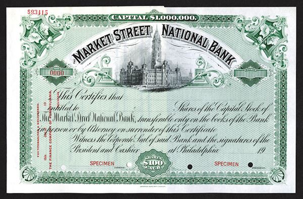 Pennsylvania. -Odd Shrs Stock Certificate. POCs. Specimen. ABNC. Philadelphia City Hall vignette. Very Fine +