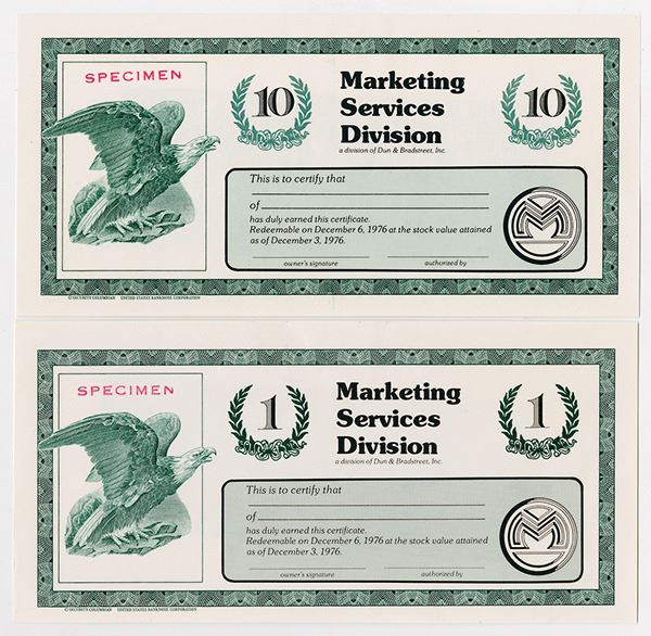 Dun & Bradstreet. Pair of SPECIMEN certificates, one for 1 Unit, the other for 10 Units, both featuring Alfred Jones's "Great Eagle" vignette. Uncirculated. SC-USBN.