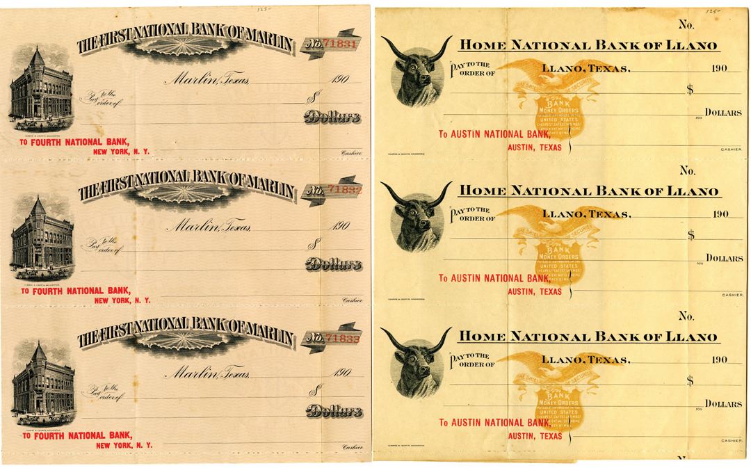 Texas 1900s. Lot of 2 pieces, both are Uncut sheets of 3 Specimen/proofs: Home National Bank of Llano, Uncut Check Trio, Black text with brown undertint of an eagle and shield, Steer at left, VF condition; First National Bank of Marlin, Black text with building at left, VF condition with some staining. Both have lithograph printing details on back. (2)