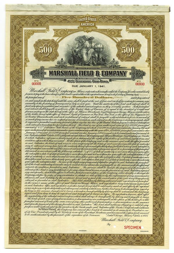 Illinois, 1925, $500, 4 1/2% Debenture Gold Specimen Bond, Black on brown border and underprint, Allegorical woman with globe top center, POC's red SPECIMEN overprint and red s/n "00000", VF condition, ABNC.