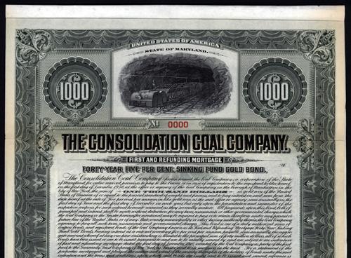 Maryland, 1910, $1000, Specimen 5% Mortgage Bond, Green border with coal mine vignette, POC's, Coupons attached, XF.